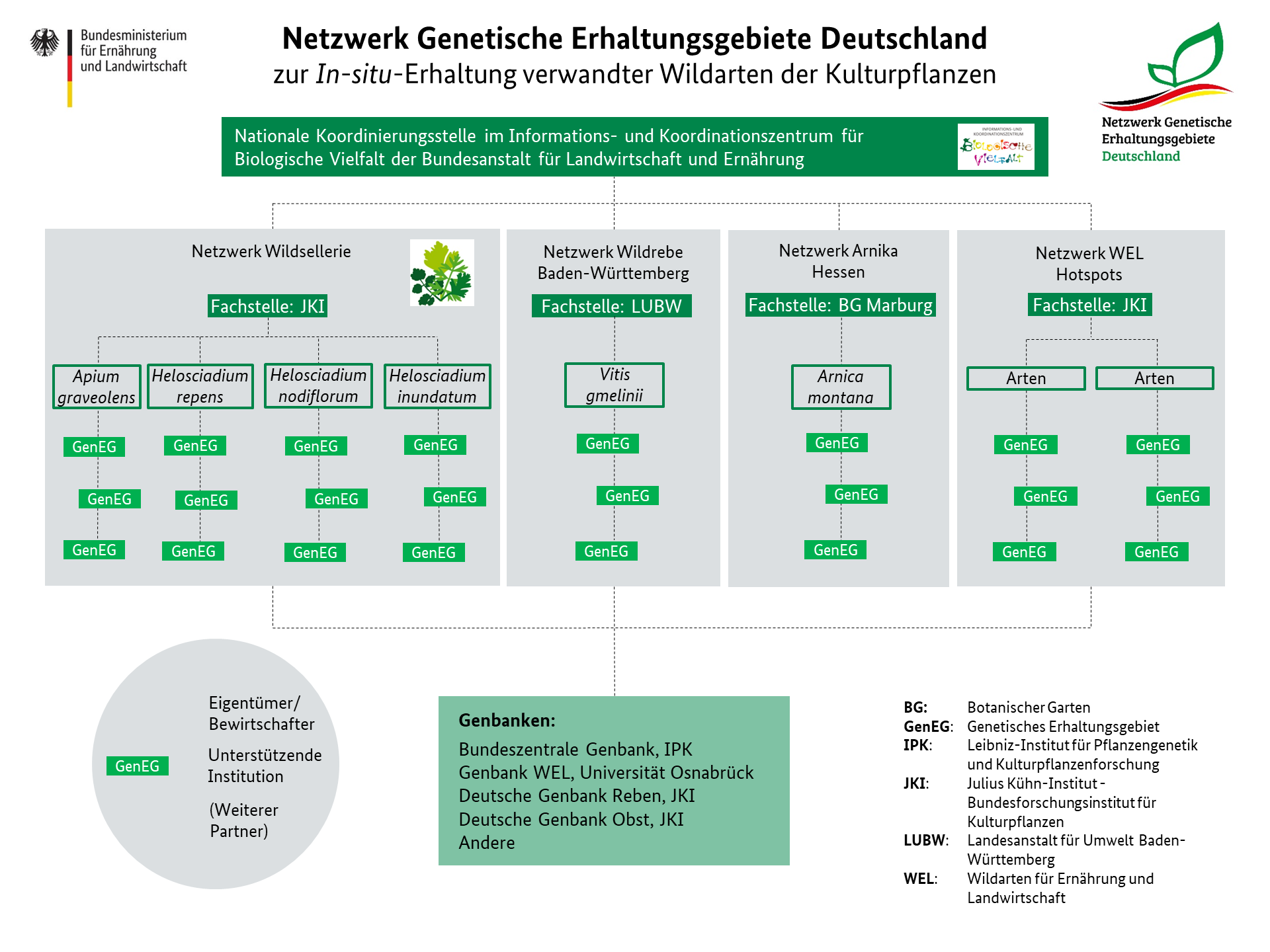 Mit der Einrichtung in 2019 des nationalen „Netzwerk Genetische Erhaltungsgebiete Deutschland“ ist eine Rahmenstruktur geschaffen worden, in der sich bestehende und zukünftige WEL Erhaltungsmaßnahmen eingliedern und koordiniert werden können. Das nationale Netzwerk wird vom Informations- und Koordinationszentrum für biologische Vielfalt der Bundesanstalt für Landwirtschaft und Ernährung koordiniert. Es besteht aus Teilnetzwerken für prioritäre WEL Arten oder Artengemeinschaften, die von Fachstellen koordiniert werden. Teilnetzwerke bestehen aus GenEGs für Populationen, die basierend auf wissenschaftlichen Kriterien ausgewählt werden.